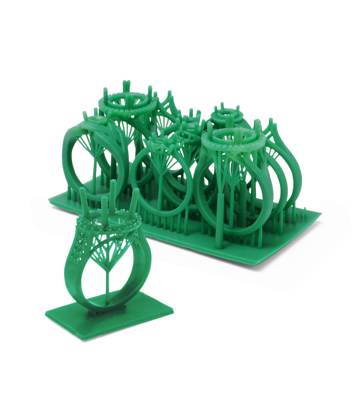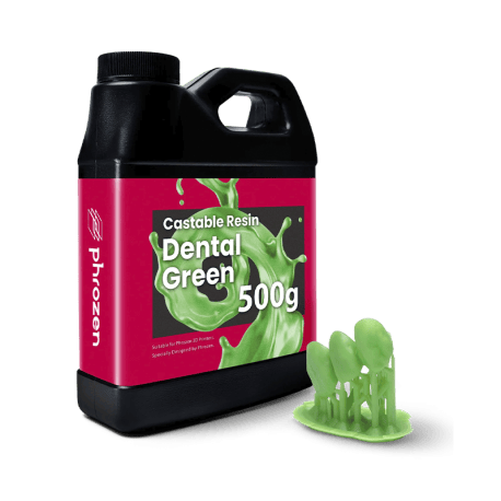 Phrozen Castable Resin W20 Green is designed for reliable casting with clean burn and zero ash content. It is designed for both jewellery and dental castings, specifically for fine and delicate items such as milgrain, micro nail and wire patterns as well as engraved and embossed text.
