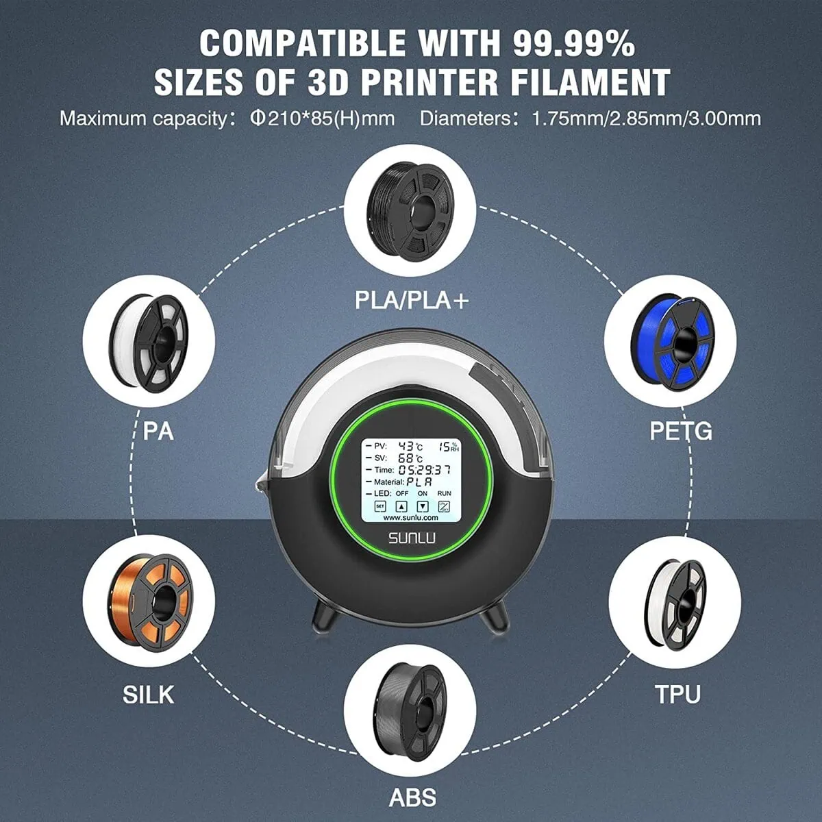 The Sunlu FilaDryer S2 drying system is a device that allows you to prepare any filament for printing in a convenient and fast way. The FilaDryer S2 is designed to seamlessly handle any type of material, from PLA to extremely hygroscopic materials such as BVOH and Nylon.