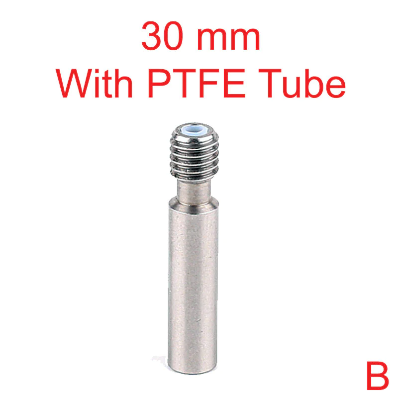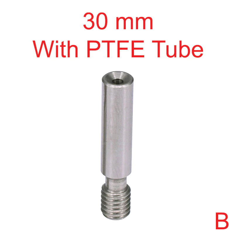 Heatbreak with PTFE tube means PTFE tube inside the metal throat. The advantage of using PTFE tube is that the filament moves smoothly and easily, which is good for PLA filament. But the disadvantage of PTFE tube is the temperature limitation. You can’t set the temperature too high, otherwise the PTFE tubing will melt and stick and make the heater jam.