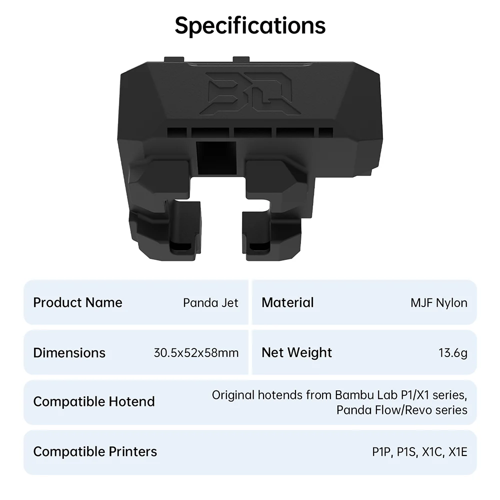 Panda Jet is a multi-directional fan cooling duct printed with high quality MJF nylon that features high temperature resistance, high strength, corrosion resistance and durability, providing long lasting performance. Panda Jet’s innovative air path design and angled outlet placement precisely directs cooling air to the nozzle, improving bridging and overhangs while keeping the view of the print unobstructed. It allows seamless installation to Bambu Lab’s P1/X1 series hot ends, and also works with the Panda Flow and Revo series hot ends.