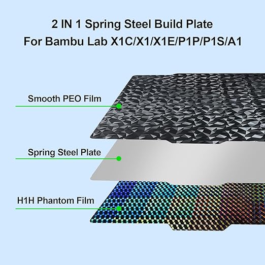 The new improved PEO+H1H build plate has a stronger adhesion than traditional textured plate, allowing easy printing of filament on the spring steel plate. We recommend the following filaments: PLA/PETG/ABS/TPU (PLA: 60~65℃; PETG: 70-80℃).