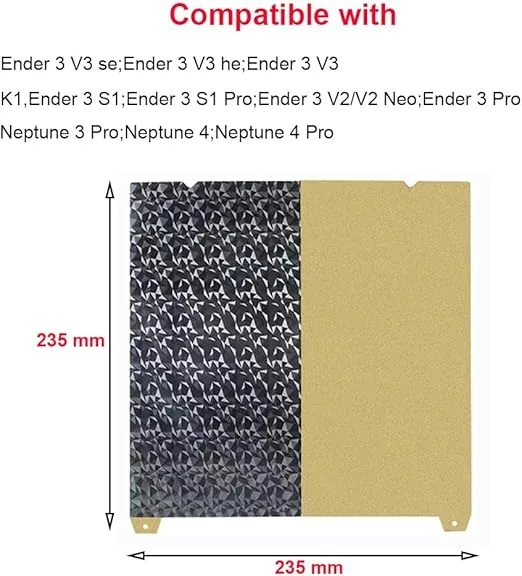 PEO+PEI with dimensions 235×235 mm is compatible with the 3D printer K1/Ender 5 S1/Ender 3 S1 Pro/Ender 3 S1/Ender 3 V2 Neo/Ender 3 V2.