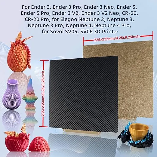Double sided PET+PEI spring steel plate , one side is smooth printing surface – enhanced PET film. The other side is PEI frosted surface, presenting a characteristic frosted touch to the sticker surface, provides greater adhesion to the pattern and print without deformation.