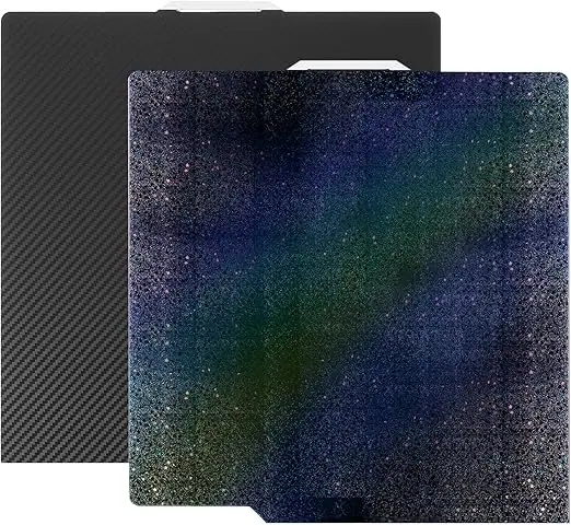 High temperature resistance: the PET surface can withstand high temperatures up to 120°C. Works well with PLA, TPU, PETG. Size: 257 mm length x 257 mm width, thickness: 0.5 mm.