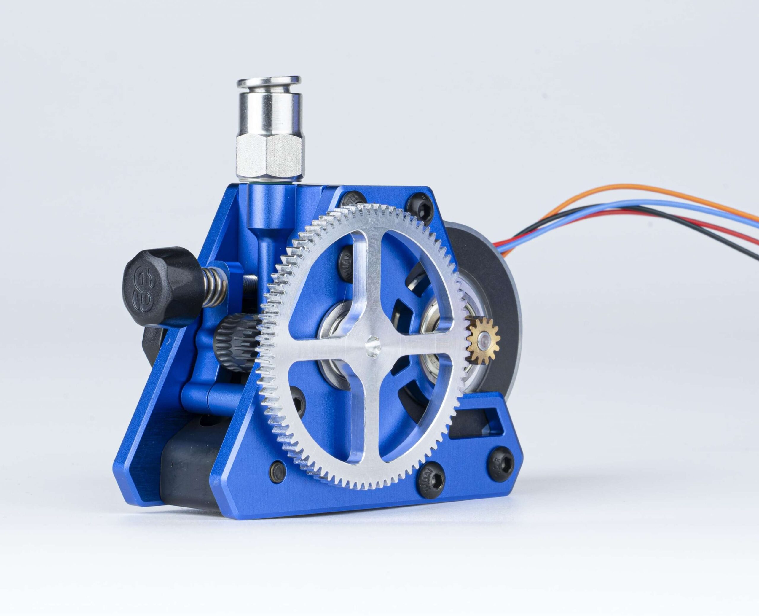 The APUS extruder has a gear ratio of 6.3/1, and the gears have the appropriate number of teeth for optimum gear construction. The teeth of the Dual Drive gear system are optimized for perfect gripping of all filament types and are RNC hardened. This hardening process increases wear resistance and gives the Dual Drive gears a polished surface. The tightly tapered filament path makes the extruder more reactive and as such ensures that the extrusion process is as consistent as possible. Using the hand wheel, the user can easily load and unload the filament without having to rely on loading and unloading macros in Gcode.