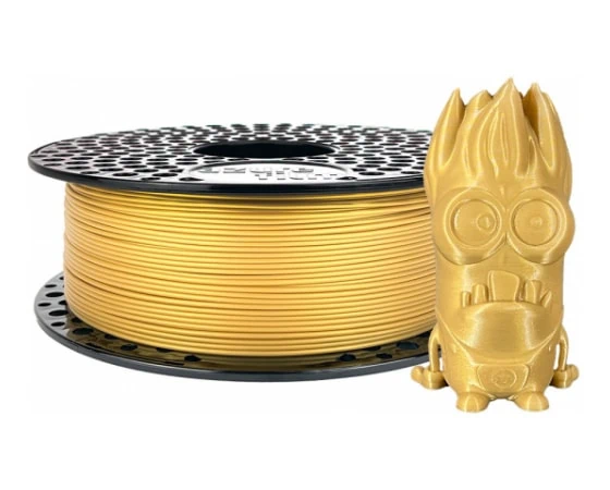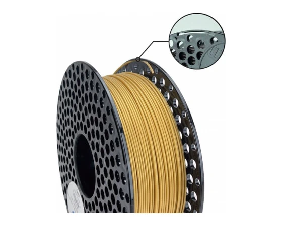 AzureFilm PLA Filament – Golden Champagne (filament), with a net weight of 1 kg (2.2 lbs) in rolls with an outer diameter of 210 mm, an inner opening of 60 mm and a width of 62 mm. The filament is vacuum sealed in a pouch that absorbs moisture and allows the filament to stay fresh and ready for use. The thread diameter is 1.75 mm and is produced in 30 different shades.