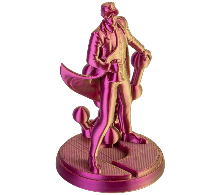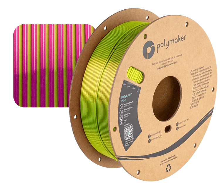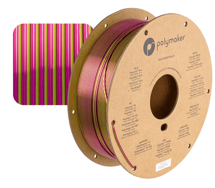 The high-quality, glossy and dichromatic PolyLite Dual Silk PLA prints two-color patterns with a dynamic color transition effect.