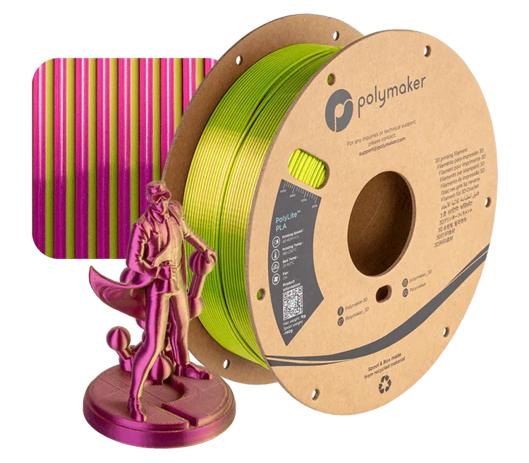 PolyLite™ PLA Dual Silk is a dichromatic PLA silk filament for 3D printing that is produced in two different colors to give models a striking two-tone effect. It’s the perfect choice for creating unique, eye-catching multi-color prints with an elegant surface finish that hides the layers. Made from high quality materials, PolyLite™ PLA Dual Silk combines the luxury and elegance of silk with the flexibility and printability of Silk PLA.
