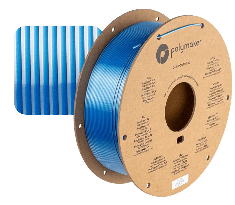 The high-quality, glossy and dichromatic PolyLite Dual Silk PLA prints two-color patterns with a dynamic color transition effect.