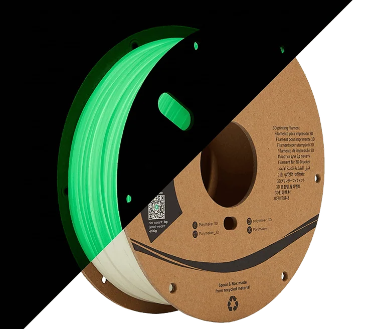 - Jam-Free™ Technology – Polymaker has incorporated its Jam-Free™ technology into PolyLite™ Glow in the dark PLA to improve filament thermal stability with a softening temperature in excess of 100°C, resulting in excellent print quality with zero risk of nozzle clogging caused by thermal creep [1].