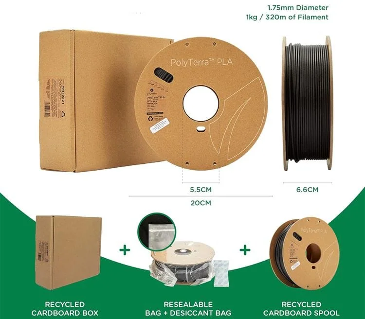 Bioplastic Mat PLA Formula – PolyTerra™ PLA is based on a newly developed material from Polymaker called FBC (Fully Bio Compound). It is a compound of high quality Ingeo PLA supplemented with naturally occurring elements. The result is a PLA filament with less plastic content that feels softer and more elastic/less brittle on the reel. Polymakers FBC formula contains less PLA plastic to degrade, which improves the rate of degradation under specific industrial conditions. Like other PLAs, the degradation rate is still very slow at ambient temperature.