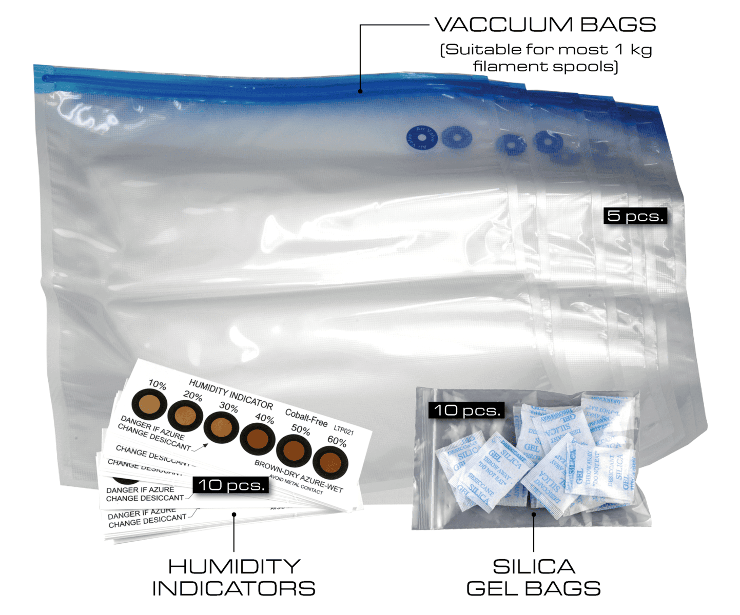 The storage kit is very easy to use. Place your spool of filament in the vacuum bag, add a silica gel bag and a humidity indicator and seal the bag. The valve is self-closing for ease of use.